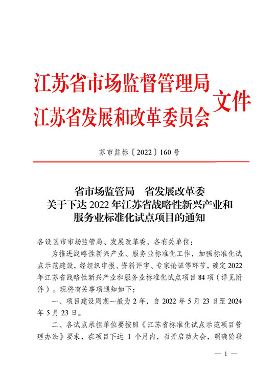 江蘇省戰(zhàn)略性新興產(chǎn)業(yè)標(biāo)準(zhǔn)化試點(diǎn)項(xiàng)目由省市場監(jiān)督管理局和省發(fā)展和改革委員會(huì)共同組織。項(xiàng)目對(duì)申報(bào)單位有著明確的要求:市場占有率和經(jīng)濟(jì)效益排名位于本地區(qū)同行業(yè)前列,具有良好的發(fā)展?jié)摿Γ邆浣y(tǒng)籌技術(shù)創(chuàng)新、標(biāo)準(zhǔn)研制和產(chǎn)業(yè)化的能力等等。