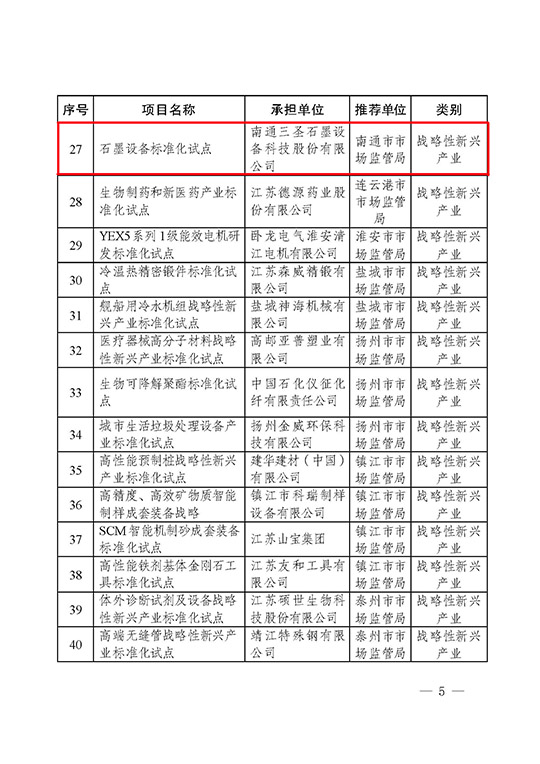 南通三圣標(biāo)準(zhǔn)化工作再傳捷報(bào),公司申報(bào)的“石墨設(shè)備標(biāo)準(zhǔn)化試點(diǎn)”項(xiàng)目獲得江蘇省市場監(jiān)督管理局、江蘇省發(fā)展和改革委員會(huì)正式立項(xiàng),成為2022年江蘇省戰(zhàn)略性新興產(chǎn)業(yè)標(biāo)準(zhǔn)化試點(diǎn)41個(gè)項(xiàng)目之一,也是南通市獲此立項(xiàng)的兩個(gè)項(xiàng)目之一 。
